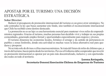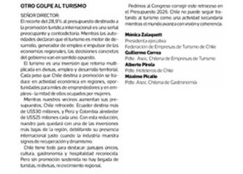 Señor Director: Reducir el presupuesto de promoción internacional del turismo es un grave error estratégico. No solo contradice la ley que busca aumentar este fondo, sino también el reconocimiento internacional que Chile ha recibido como destino destacado.