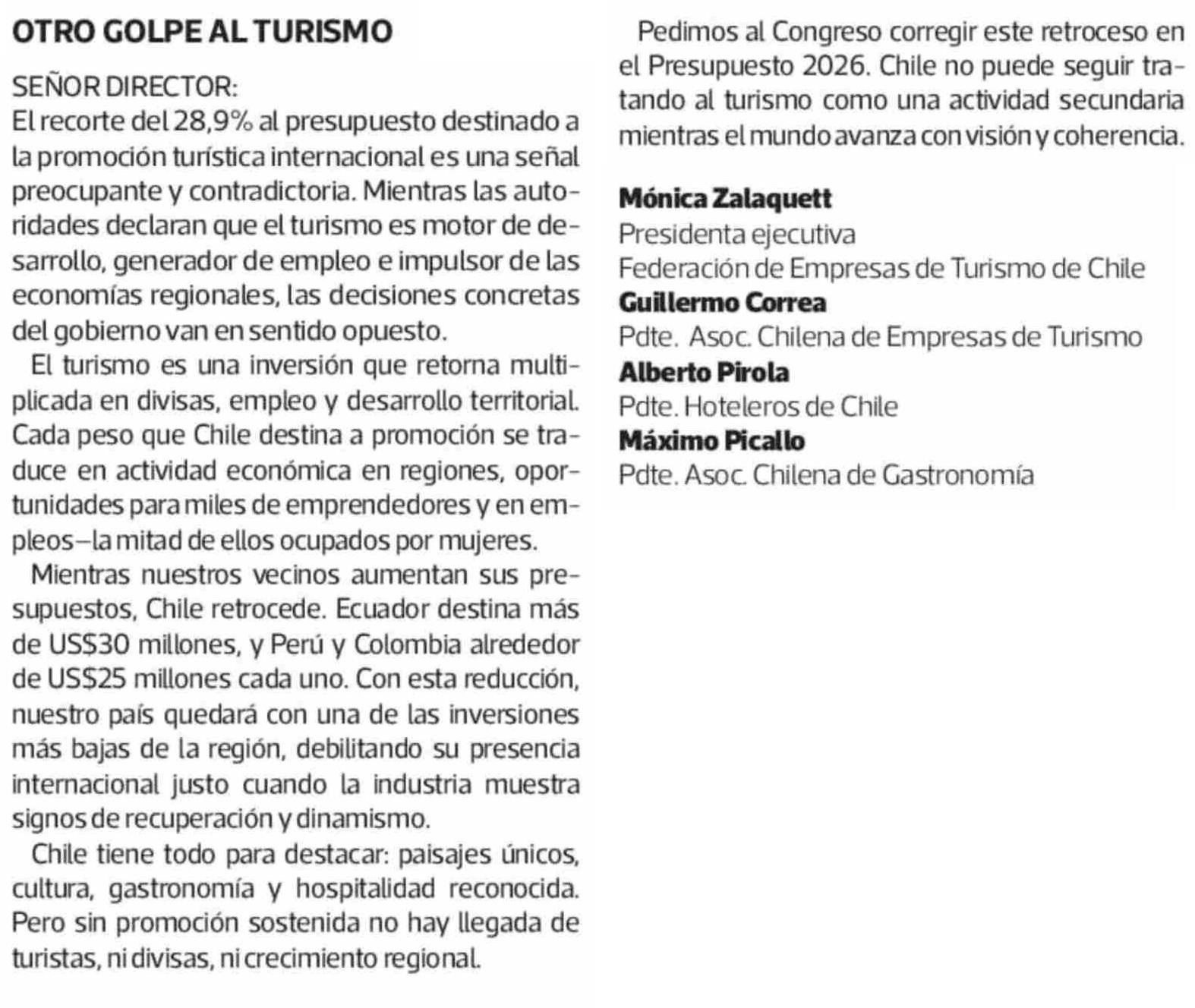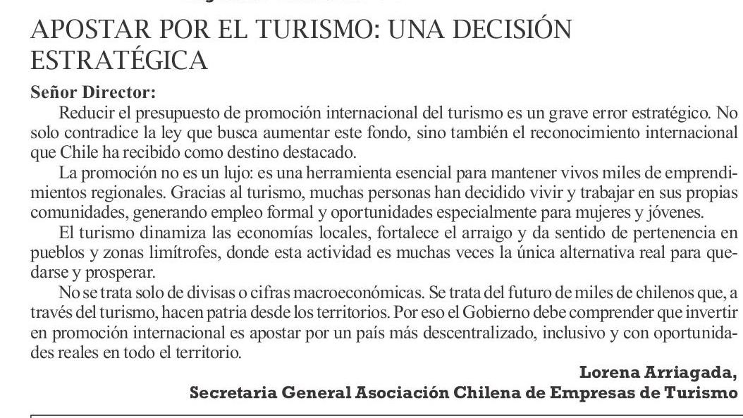 Señor Director: Reducir el presupuesto de promoción internacional del turismo es un grave error estratégico. No solo contradice la ley que busca aumentar este fondo, sino también el reconocimiento internacional que Chile ha recibido como destino destacado.